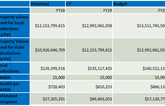 Each district is different, and property value changes impact each district differently.  You will want to modify these tables as necessary to help your school board understand how property value changes impact available revenue in your district so they can make thoughtful long-term spending decisions that protect the fiscal health of the district.