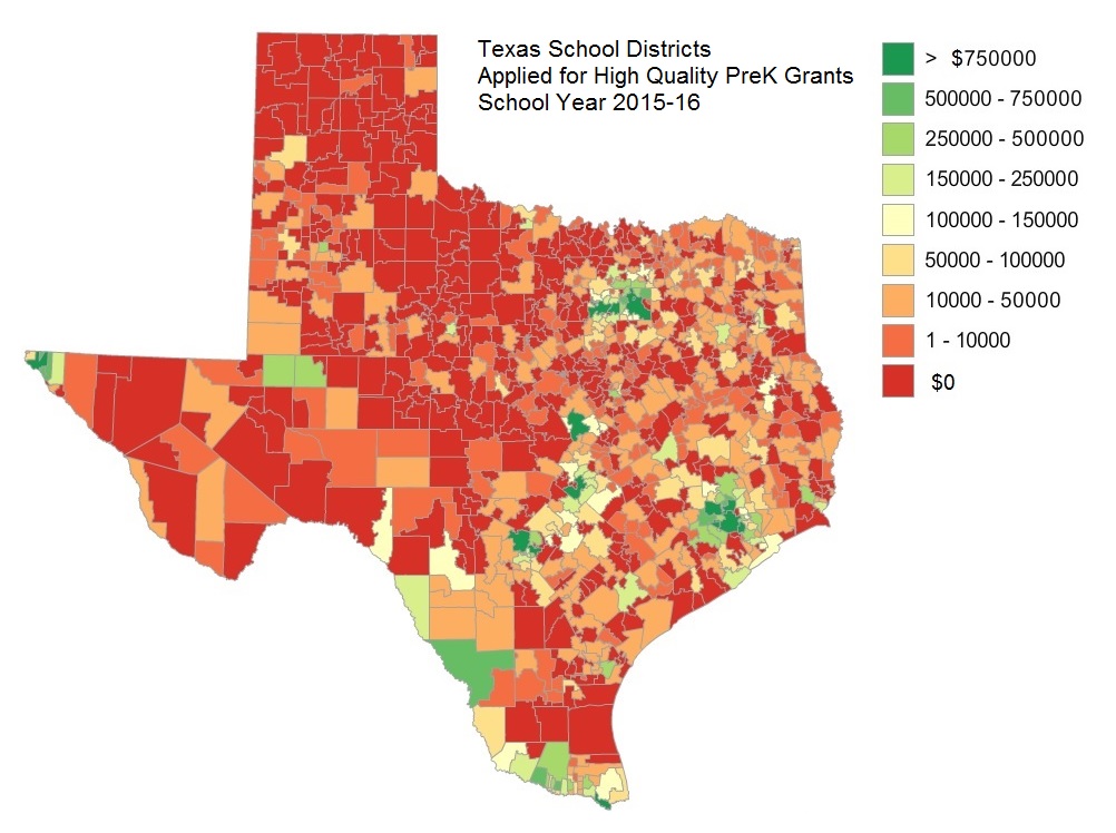 The map below shows the location of school districts that applied in school year 2015-16 for the High Quality Prekindergarten grants. School districts that applied were primarily located in or near urban and suburban population centers, and also tended to be located in the Eastern half of the state of Texas. School districts that did not apply tended to be school districts with relative small numbers of enrolled students and also tended to be located in the Western half of the state.