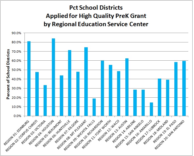 According to the chart below, the percentage of school districts that applied for the High Quality Prekindergarten grant is correlated to the location of their regional education service center. As shown in the map above lowest application rates in the Western half of the State of Texas are found in Regions 9 in Wichita Falls, 14 in Abilene, 15 in San Angelo and 16 in Amarillo. The lowest application rates in the Eastern half of the State of Texas are found in Regions 3 in Victoria and 5 in Beaumont.