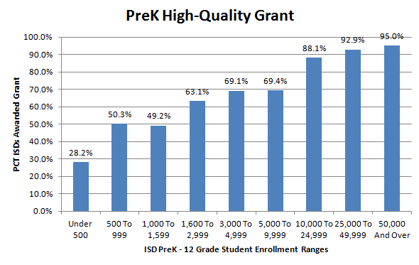 About 50 percent of Texas school districts were awarded high-quality prekindergarten grant funds for school years 2015-16 and 2016-17. However, the demographics of school districts that applied for and were awarded the grants varied substantially. Grant awards correlated with the total Prek through 12 grade student enrollment of school districts. Large suburban and urban school districts were more successful in applying for the grant compared to smaller student enrollment school districts. Grants were awarded to 9 out of 10 districts serving 10,000 or more students in Prek through 12th grade. However, only 1 of 3 districts serving less than 1,000 students in Prek through 12th grade were awarded grants. This is significant considering 50 percent of Texas school districts have an total student enrollment of less than 1,000 students.