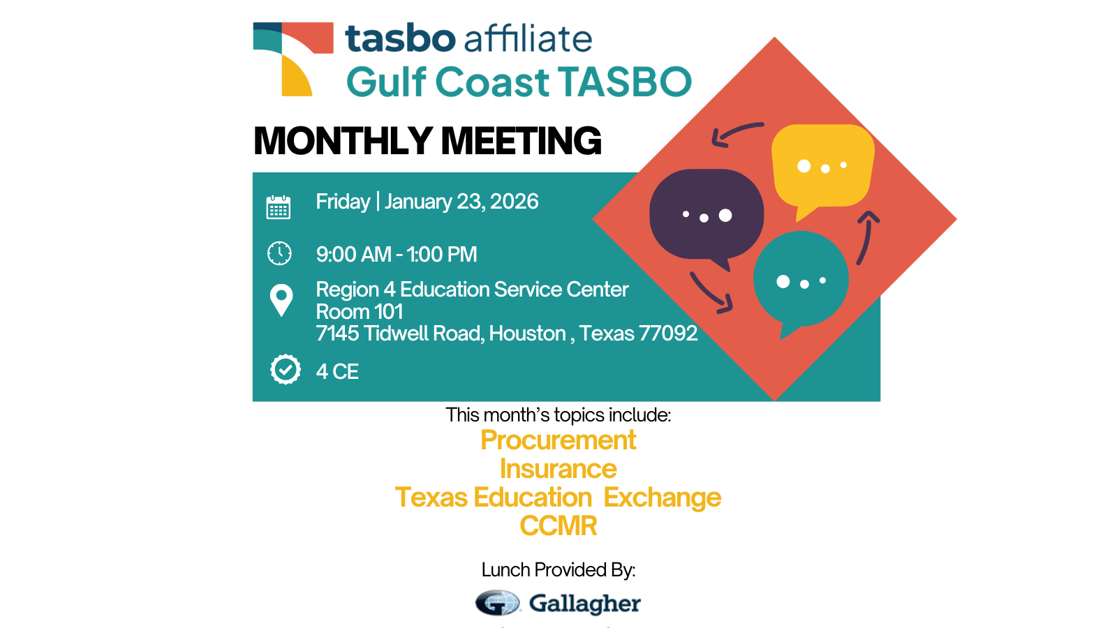 We are excited to share the details for the next Gulf Coast Affiliate Meeting. We meet in-person at the Region 4 Education Service Center from 9AM-1PM on Friday, January 23, 2026.